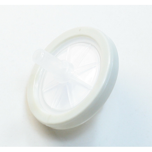 This filter can be mounted on a syringe. The filtering can be done by means of pushing the syringe without foreign pressure. The transparent high-polymer polypropylene material can be used for making the filter with high glossiness, small and dainty external form. In comparison with traditional filters, this filter has higher resistance to pressure . This filter has a good structure so as to insure wholeness of filter membrane and smoothly filtering.